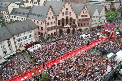 Ivan: La gara ha due zone cambio. Il nuoto si svolge in un laghetto (cava) fuori città per cui la T1 si trova lì, mentre la T2 e l’arrivo sono in pieno centro, rispettivamente lungo il fiume e nella piazza storica Romerberg. In entrambi i casi il mio hotel si trovava in zona centro, a poca distanza dalla T2. E’ la soluzione ideale, visto che per raggiungere la T1 l’organizzazione appronta un servizio navette molto efficiente che parte proprio dall’aerea vicino alla T2, sia il giorno prima per portare la bici sia la mattina della gara.