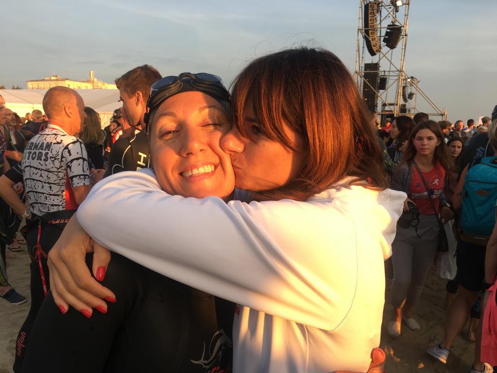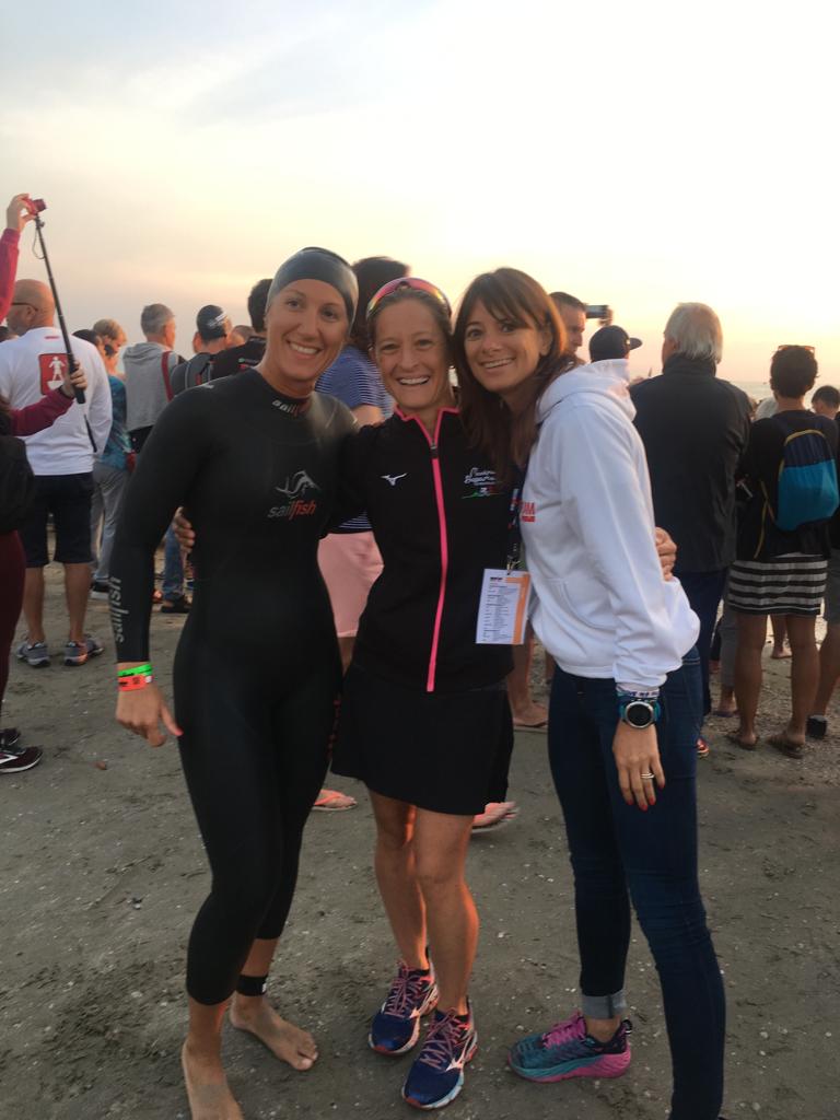 Anna: Qui è nata l’ansia. Il giorno prima della gara siamo andati ad “assaggiare” il mare: acqua calda (e se lo dico io significa quasi da vasca da bagno), ma piena di meduse grandi quanto il mio piede da 40-41. Dicono siano poco urticanti, ma di certo sono poco rassicuranti. Mi sono rilassata solo quando, al briefing pre-gara, hanno comunicato “muta facoltativa per gli age- group”.