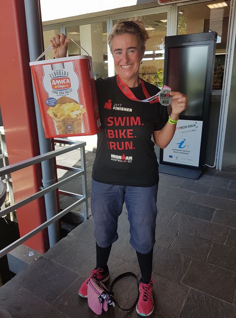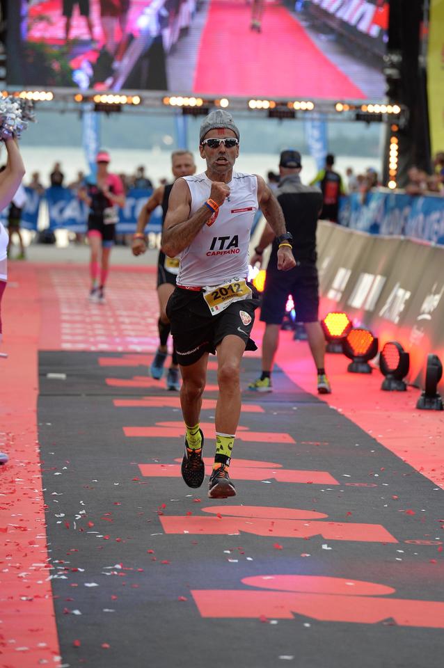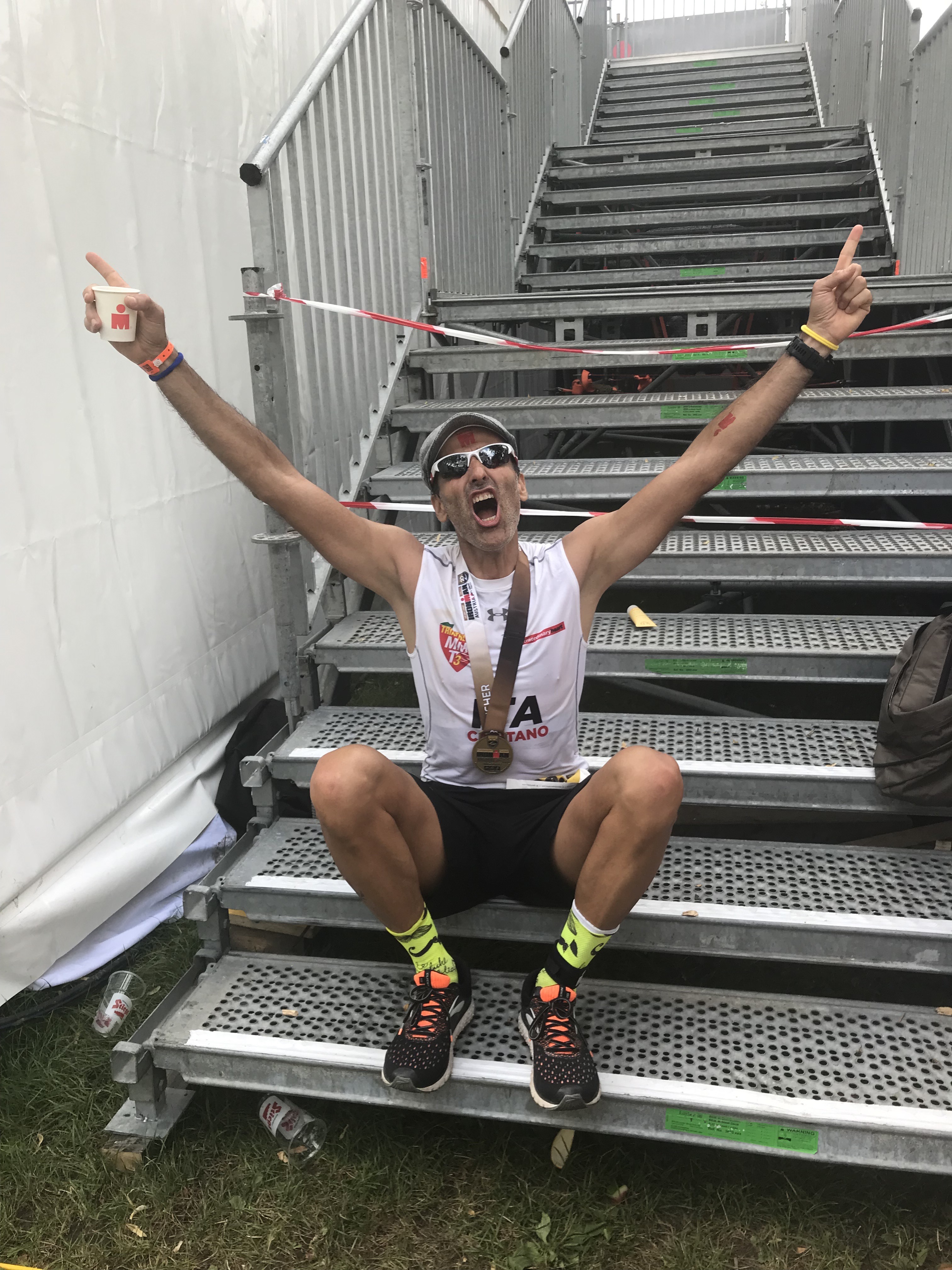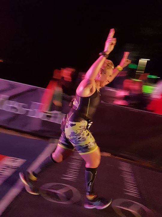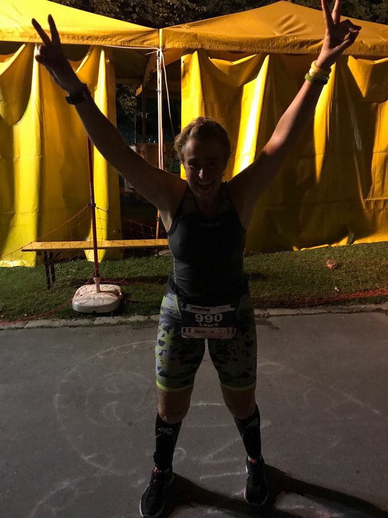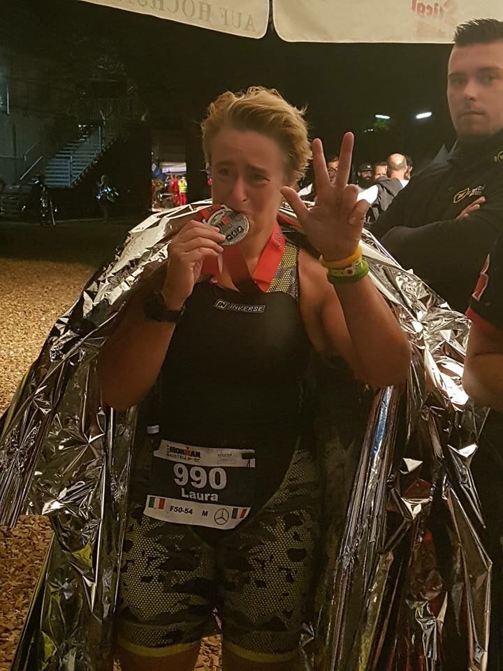 Laura: Corsa… la mia bestia nerissima! Due giri, per me molto faticosi per la testa. Ho bisogno di avere riferimenti frequenti, nella maratona di un Ironman. In alcuni tratti quasi nessuno a tifare ed incitare. Poi c’è un po’ di sterrato. Bisogna stare attenti quando viene buio, ahimè, già… io sono lentissima e corro col buio. Il passaggio nel centro del paese, in piazza, davanti alla gente che cena sui tavolini all’aperto, è divertente. Si cerca allora di darsi un tono, e di non sembrare stanchi o distrutti… 😂😂😂magra illusione. Poi si torna nell’oscurità e si può tranquillamente tornare ad arrancare. Quando però ci si avvicina al traguardo, si sentono le voci e la musica e l’energia torna a scorrere nel corpo. Gli ultimi metri si fanno esultando tra la folla, emozione straordinaria.