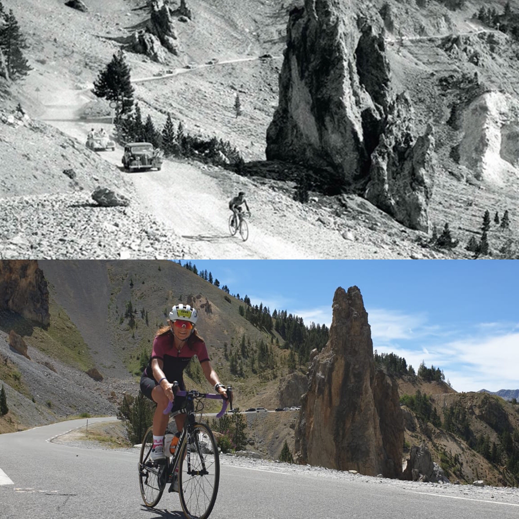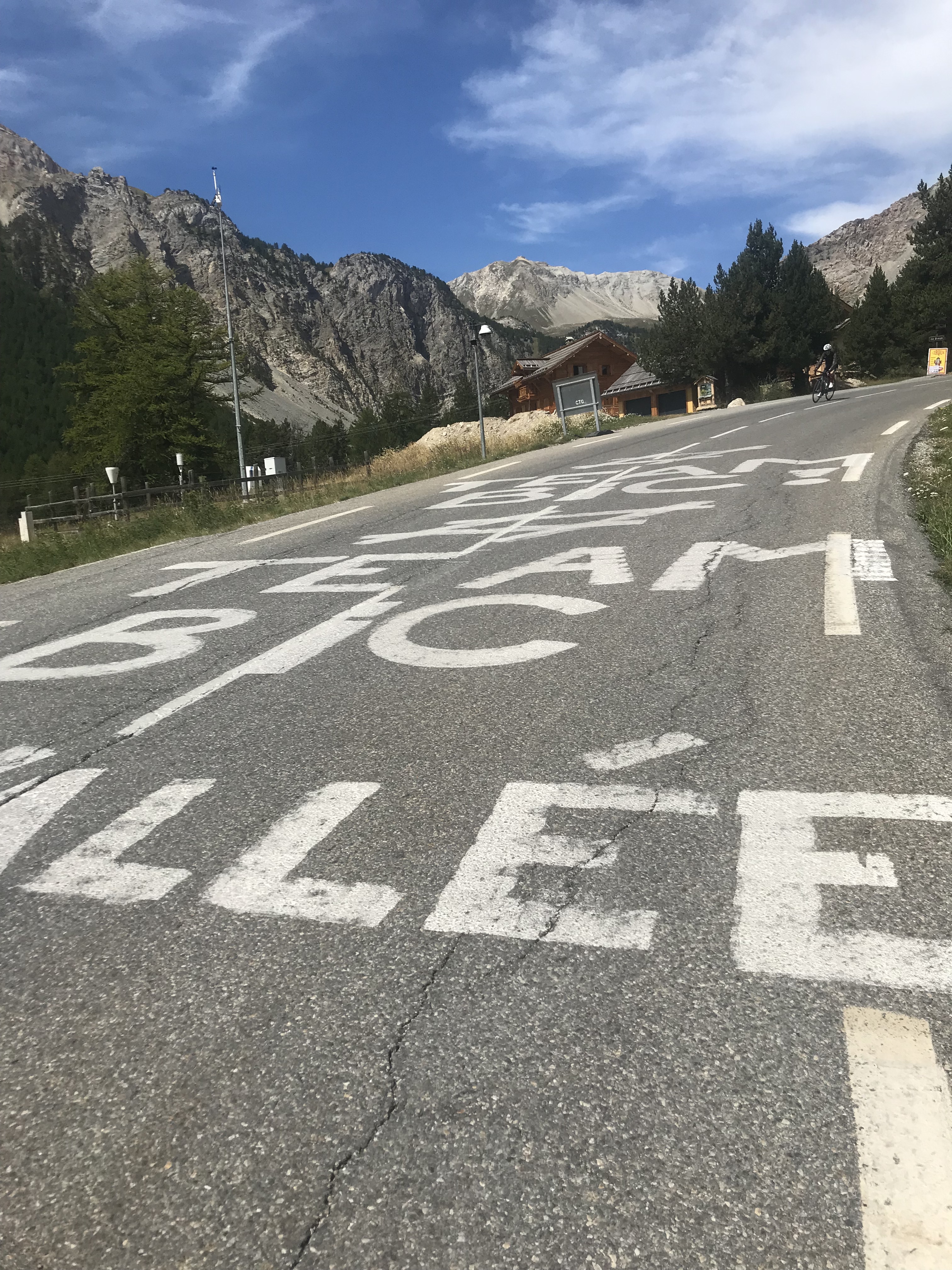Eccoti là, adesso sì che ti riconosco, sei quello dei racconti epici, vedo le curve, vedo il ghiacciaio, vedo le cime che ti circondano, e leggo nomi, Izoard. Chi ha tatuato tutta questa storia sulle tue lunghe gambe? Bartali, Coppi, Pantani, Nibali. C’è persino uno smile di fianco al nome di quel pazzo di Sagan. Tifosi di passaggio, amici, amanti… tutti han lasciato un segno profondo. Indelebile fino al prossimo inverno, alla prossima neve, al tuo prossimo capriccio.