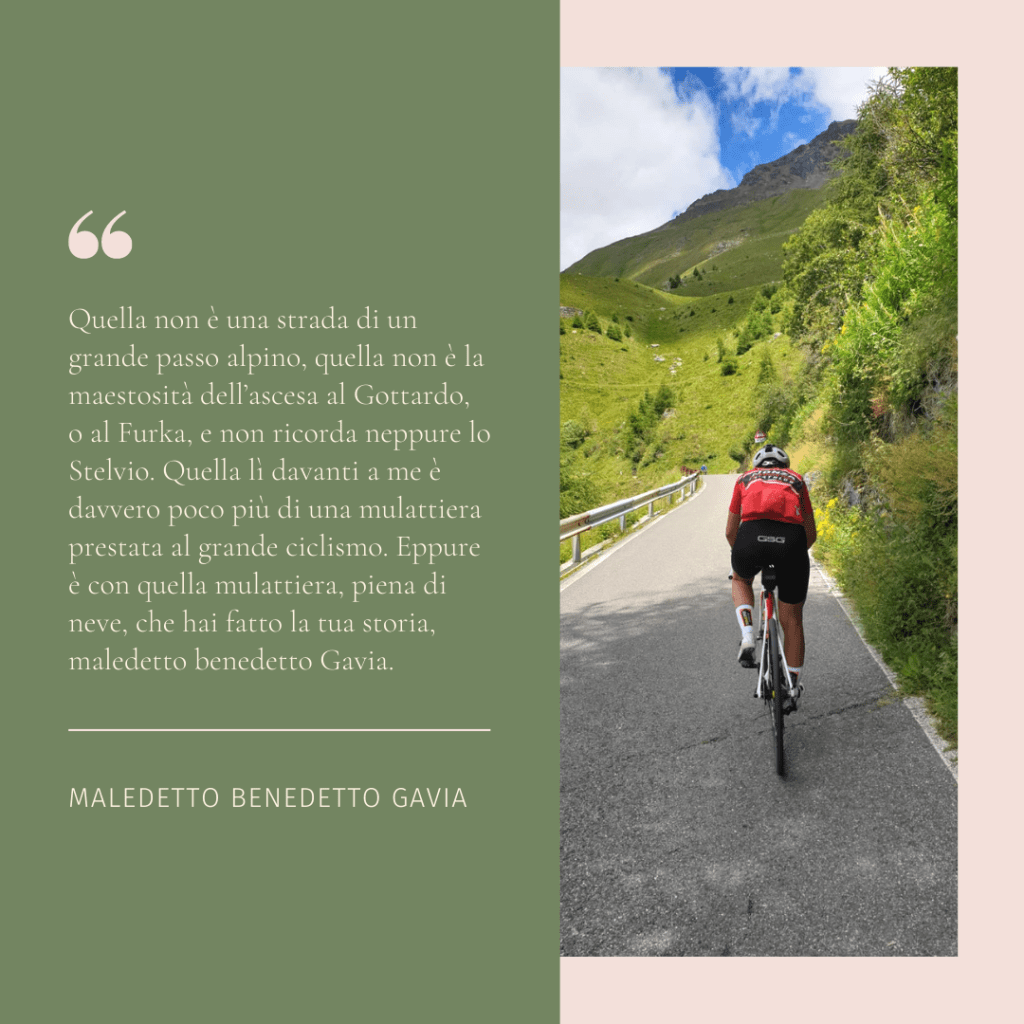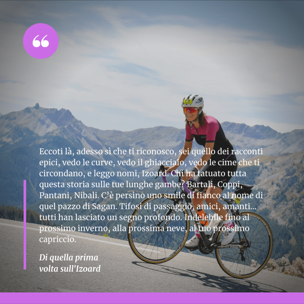 Quando pedalo, io scrivo. Nella mia testa una penna mette insieme pensieri più o meno poetici, talvolta brutali, spesso aspri come uno spicchio di limone e fastidiosi come la Coca Cola nel naso. Ogni tanto questi racconti diventano dialoghi: con la mia bici, con le mie gambe, spesso coi Passi Alpini, quando mi capita di scalarli. E allora ecco qui le mie conversazioni: non aspettatevi nessuna indicazione tecnica, pedisseque descrizioni di pendenze o suggerimenti. I Passi sono delle brutte bestie, spesso capricciose e nel migliore dei casi solo disinteressate. I miei dialoghi con loro sono spesso feroci, urlati, masticati mentre le gambe bruciano e i pensieri si sfocano nella fatica. Sono solo parole vere, di quelle che ogni tanto escono d’istinto, qualche imprecazione, non molto bon ton. Non vi offendete se leggerete gergo da spogliatoio (volendo fare commistioni col pallone) che forse qui potrei ribattezzare slang da peloton, perché quando comincio a salire io smetto di essere una donna e comincio ad essere una ciclista. Scarsa, per carità, ma una ciclista.
