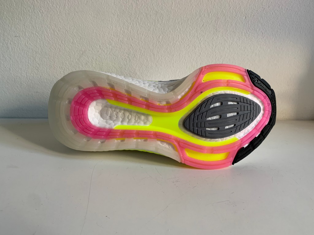 D’altro canto vi ho già parlato invece della sensazione di “aumento” del rimbalzo a seguito delle accelerazioni, un effetto combinato del boost e del LEP. La piastra gialla che costituisce il nuovo sistema di torsione infatti è piuttosto dura: potete rendervene conto semplicemente toccandola. Inoltre, osservando la suola della scarpa si nota che si estende dal mesopiede alla parte anteriore. Appare simile alle piastre in carbonio che sono una delle novità recenti di molti modelli di scarpe da corsa. Correndo però, l’effetto è davvero differente. Non posso fare paragoni con i modelli precedenti di Ultraboost, ma ho provato scarpe di altre marche con la piastra in carbonio e la sensazione di ritorno e di spinta che danno è talvolta addirittura fastidiosa. È come se la piastra avesse una reattività tale da modificare (o da dar la sensazione di modificare) anche il gesto della corsa. Non è l’effetto che si sente sulle Ultraboost 21. Quando si aumenta la velocità in effetti la spinta progressivamente è più percepibile (come se fosse una sorta di molla che quanto più flettiamo tanto più salta), ma non arriva mai a modificare sensibilmente il gesto dell’appoggio del piede.